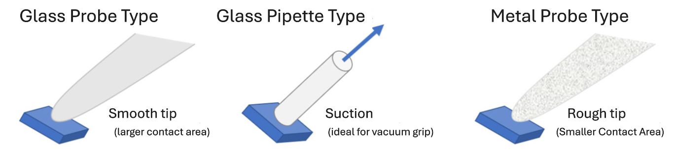Compared to metal probes, glass tools have smooth, rounded (R-shaped) tips, allowing for a larger contact area with the target object. This minimizes physical damage, such as scratches or deformation.