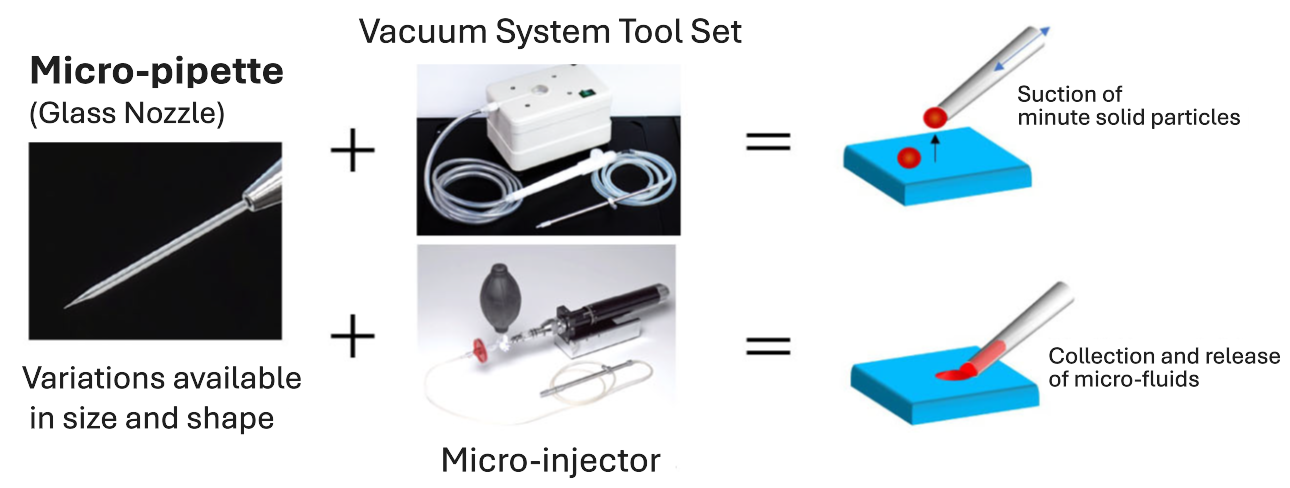 Additionally, glass pipette tools (used with vacuum suction or ultra-fine nozzle systems) can firmly capture objects, reducing the risk of particles loss.