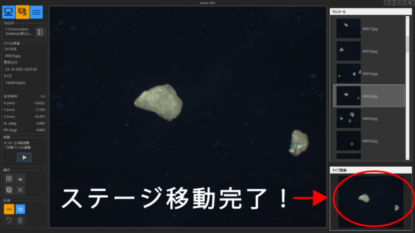 取得した画像には座標が紐づいています。②のフォルダを画像ビューアタブから開いて、サムネイルより画像を選択して移動アイコンをクリックすることで対象物を観察視野へと移動できます。