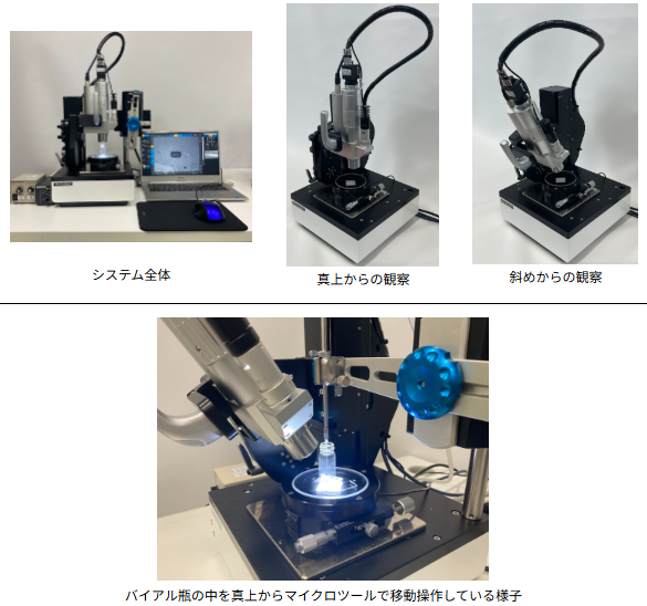 多彩なツールが標準で準備されていますのでアームの先端を付け替えるだけで、以下のような異なる作業を行えます。またマイクロスコープを斜めに傾けることで試料真上からの操作が可能となりました。